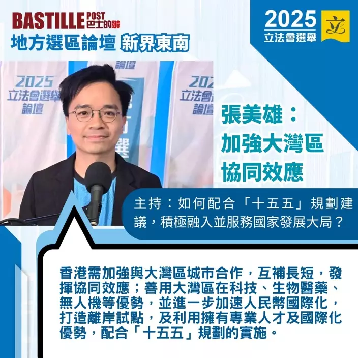 4號張美雄則認為,「十五五」規劃重點在於加快實現高水平科技自立自強,須與大灣區城市互補長短,透過協同效應落實規劃。香港優勢在於金融體系,深圳及大灣區強項在於科技實力,應當充分運用大灣區在生物科技、醫藥、無人機等優勢,結合香港金融體系,並推動人民幣國際化,建離岸市場試點;另本港擁大量法律、會計等專業人才,可善用香港與國際接軌的制度環境。