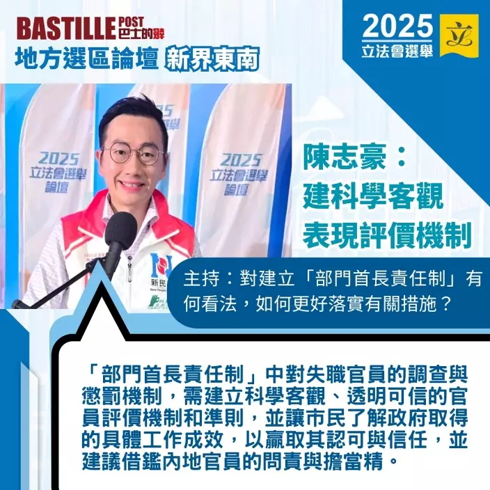 就「部門首長責任制」,5號陳志豪指,機制規定,若部門首長失誤,將啟動完善調查與懲處機制,但認為在評估官員表現時,更重要是建立一套科學、客觀、透明且可信的評價機制,才能提升政府治理效能,推動中高曾官員持續改進。這套機制應具備清晰評估標準,能讓公眾清楚了解各政策局及部門每年取得的具體工作成效;而內地官員的問責精神和擔當意識亦相當強烈,可作借鑑。