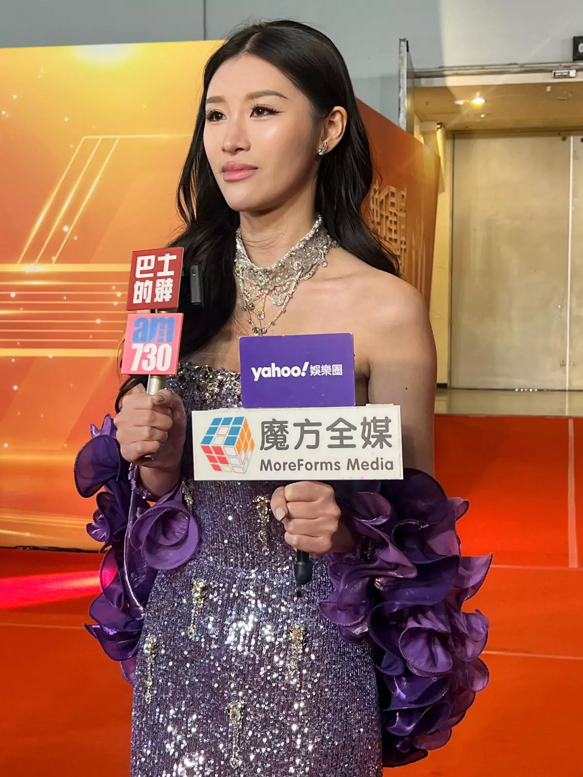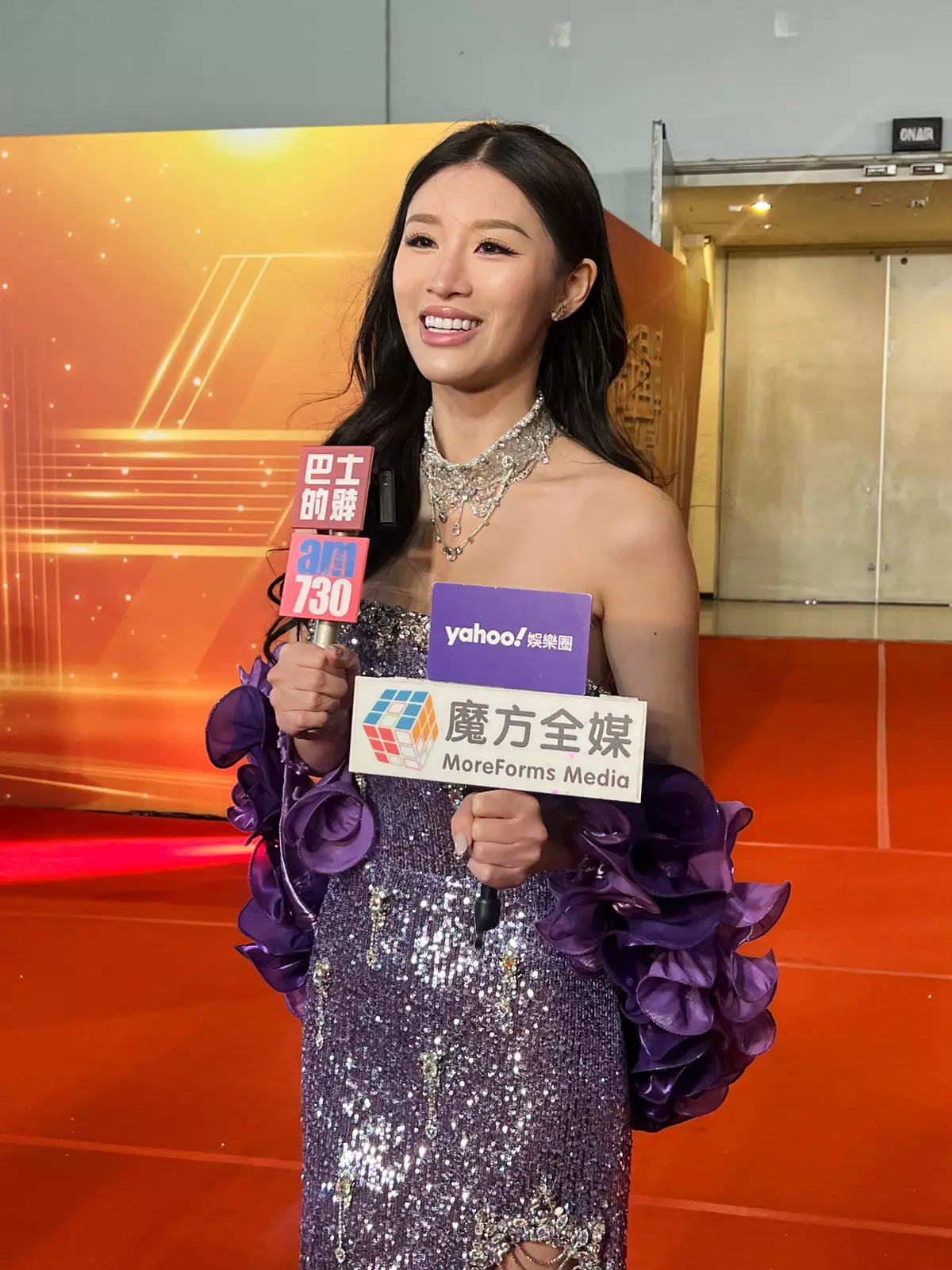 身穿紫色戰袍的juliana介紹,挑選今晚的戰衣是因為有小小復古的元素,特別是袖的設計,好特別。久未露面的她笑言自己今年工作機會不是特別多,希望來年可以多些機會。空餘時間她亦有去學習不同的嘢增值自己,包括唱歌,運動方面就有打高爾夫、試吓騎馬,學習一些新的興趣。