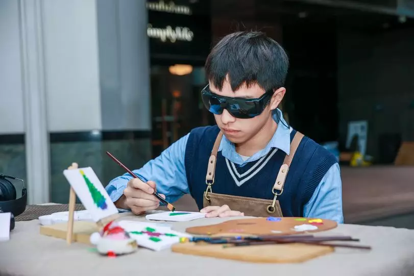 「共融藝術體驗工作坊」進駐市集,參加者將戴上耳塞、眼罩,在限制下完成指定畫作。