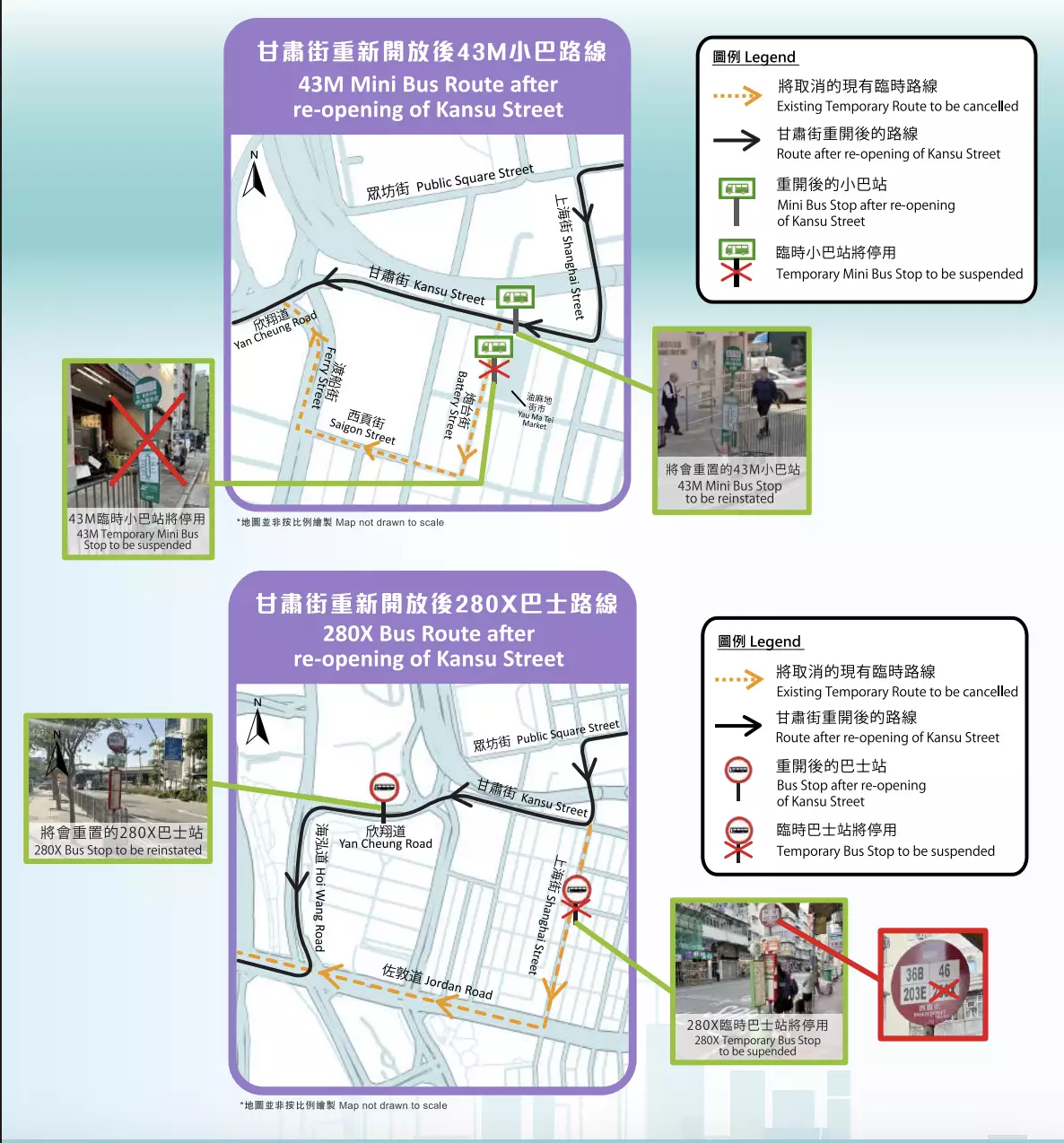 屆時由加士居道或上海街駛經甘肅街的車輛,可繼續沿甘肅街經渡船街或欣翔道前往目的地。甘肅街介乎廣東道與渡船街之間的一段行人路會重新開放,部分九巴第280X號線的巴士站,以及九龍專線小巴第43M號線的小巴站亦會重置。
