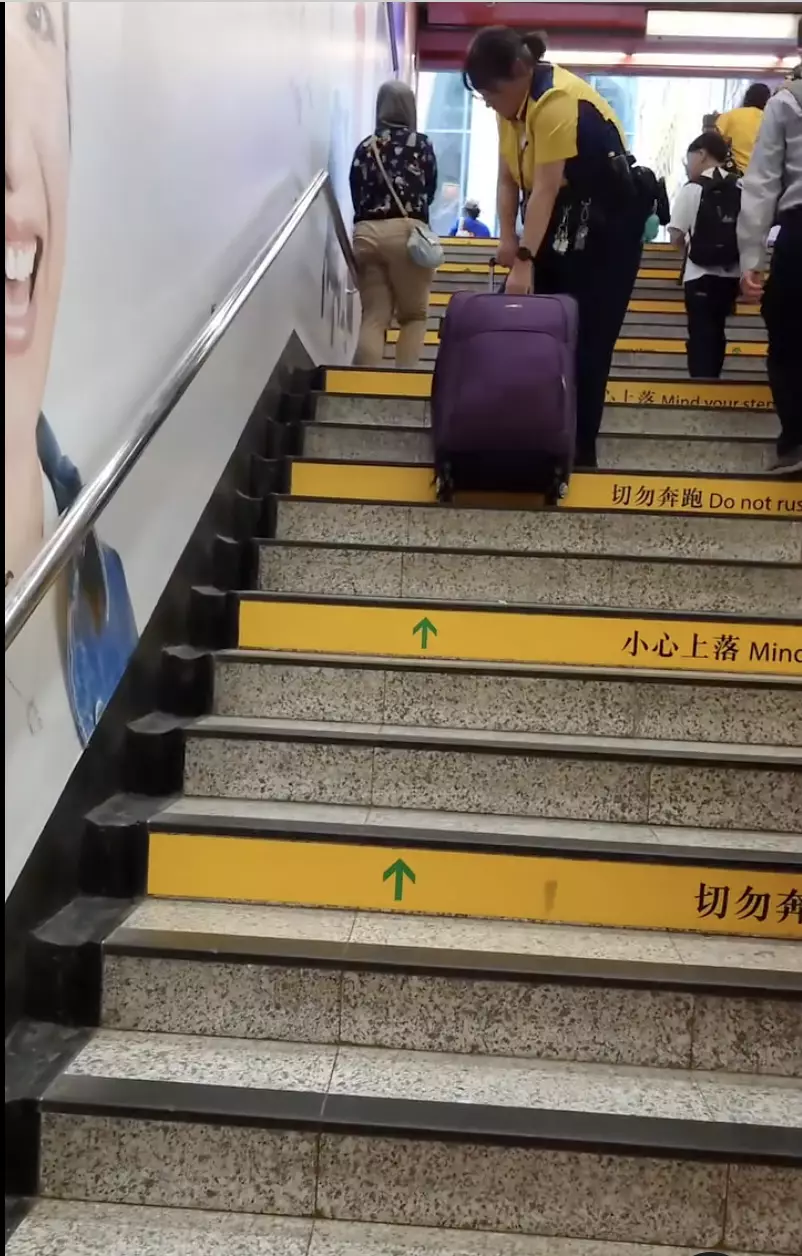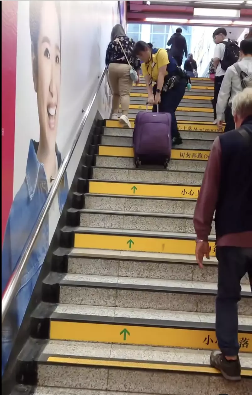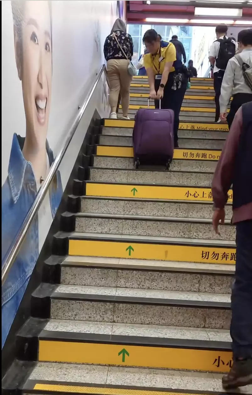 據一段網上流傳的影片可見,一名港鐵女職員在旺角站出口,協助一名外籍女乘客將沉重的行李箱一級一級拉上樓梯,目測行李箱已經塞滿行李,且異常沉重,港鐵職員整個過程都顯得相當吃力,而疑似是行李箱主人的外籍乘客則未出手協助。