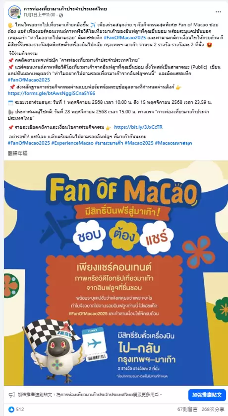 旅遊局於11月1日至15日期間,在泰國曼谷舉辦「Macao Wonder Fest 2025」線上線下促銷活動,瞄準目標客群,聯乘多家航空公司及線上線下旅行社在平台推出多項限時旅遊優惠,活動期間更進駐曼谷著名EM商圈內的BTS高架捷運站設快閃促銷攤位,通過線下加持引流至線上銷售平台,積極吸引當地居民將澳門列為必訪旅遊目的地,進一步拓展東南亞國際客源市場。