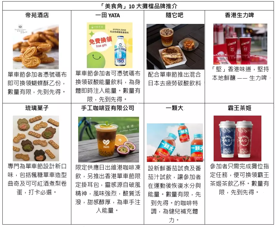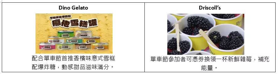 不論做運動還是看表演,都要消耗極大能量,嘉年華的「美食角」匯聚了10個大受歡迎的攤檔品牌,網羅各色各樣的甜品輕食、咖啡茶飲及健康水果等,應有盡有,不少攤檔更誠意加推全新期間限定口味產品,讓美食在齒間躍動,為一眾大小朋友帶來舌尖上的動感!同場更有多個攤位為單車節參加者準備了專屬限量禮品,包括蝴蝶酥、碳酸能量飲料及新鮮雜莓等,為車手補充能量之餘更添驚喜。