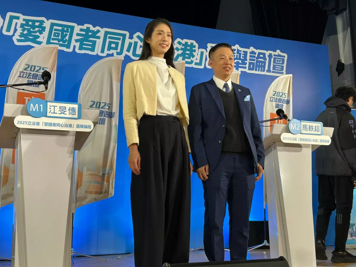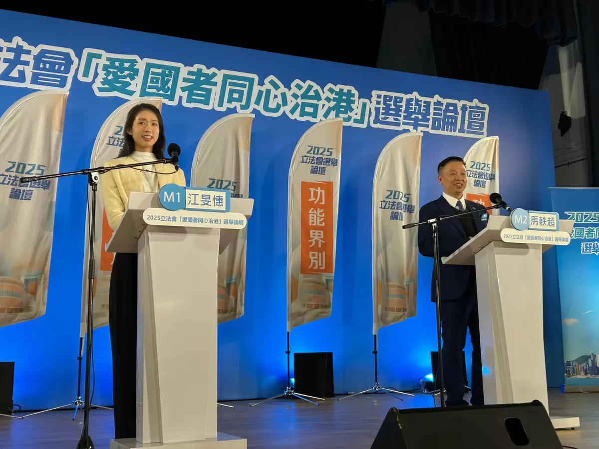 立法會功能組別旅遊界1號候選人江旻憓(左)、2號候選人馬軼超(右)出席選舉論壇。巴士的報記者攝