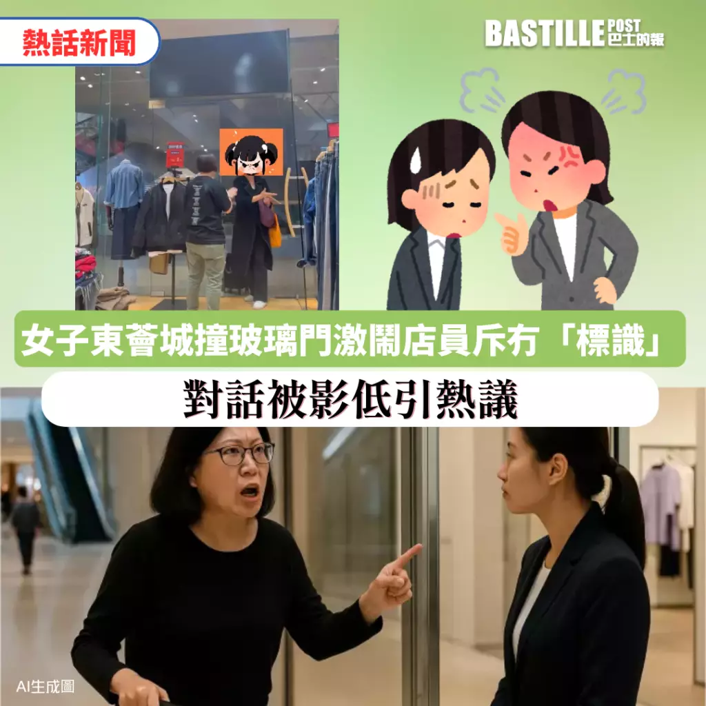 東涌一名女子撞到店舖玻璃門後激動責罵店員,全程被途人拍下並引起網上熱議。AI 生成示意圖,非當事人