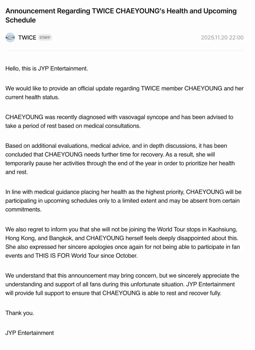 JYP娛樂官方聲明指出,彩瑛近日經醫生診斷罹患「血管迷走神經性昏厥」(vasovagal syncope),這是一種會因壓力、疲勞、脫水或特定觸發因素導致心跳減慢、血壓突然下降,進而引發暈厥的症狀。醫療團隊評估後強烈建議她需長時間充分休養。
