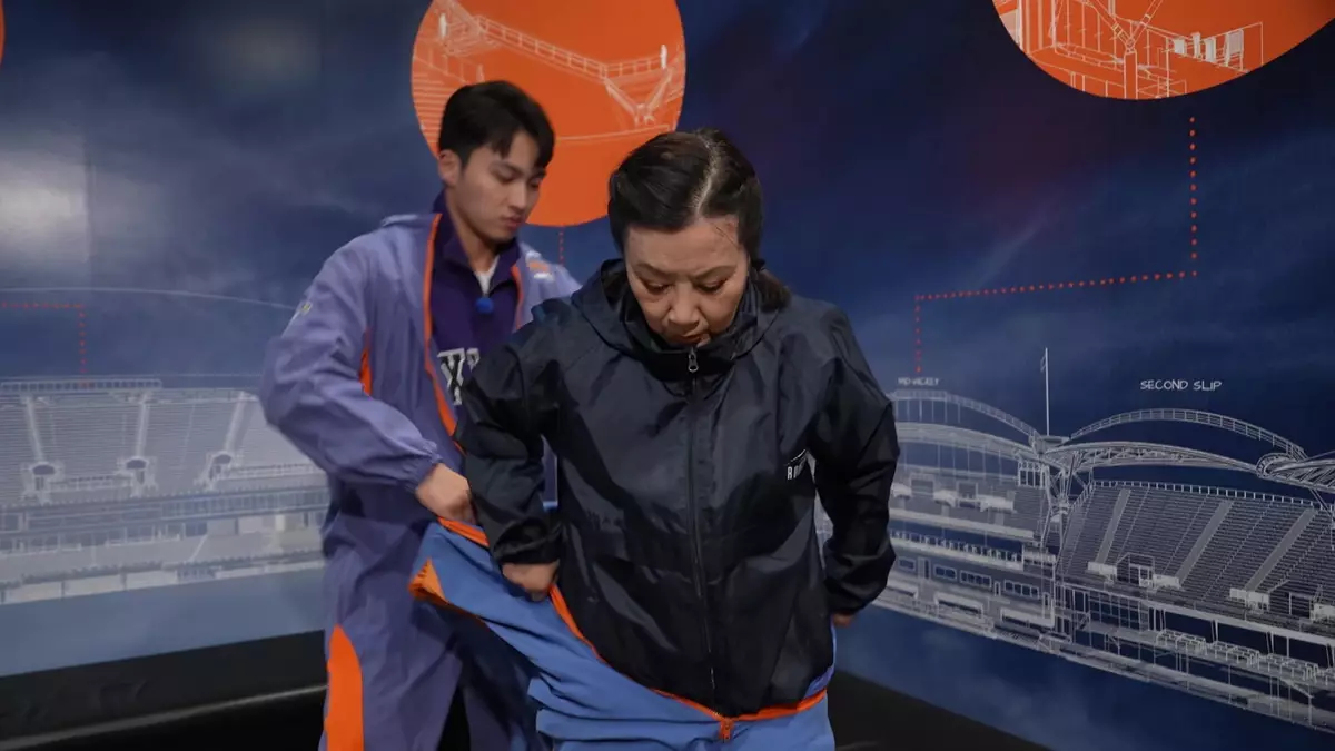 事事要確保絕對安全才敢試的Liza姐,試玩Roof Climb前有半開玩笑叫嘉洛「你試咗先試咗先」,之後阿姐依足指示靠住安全扣及繩索支撐,懸空向後仰擺出雙手放飛姿勢,雖然挑戰初段阿姐仍是勁緊張攬實嘉洛高呼「我好驚」,但經嘉洛一輪安慰後,阿姐終於豁出去完成創舉!阿姐事後坦言以往拍攝騎馬及吊威也戲時亦不免緊張,但最終仍憑藉演員的重要初心—「一roll機就要嚟啦」一一捱過,盡顯專業。
