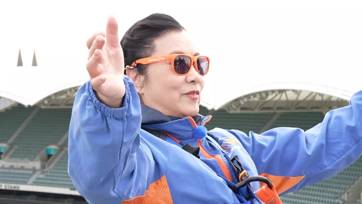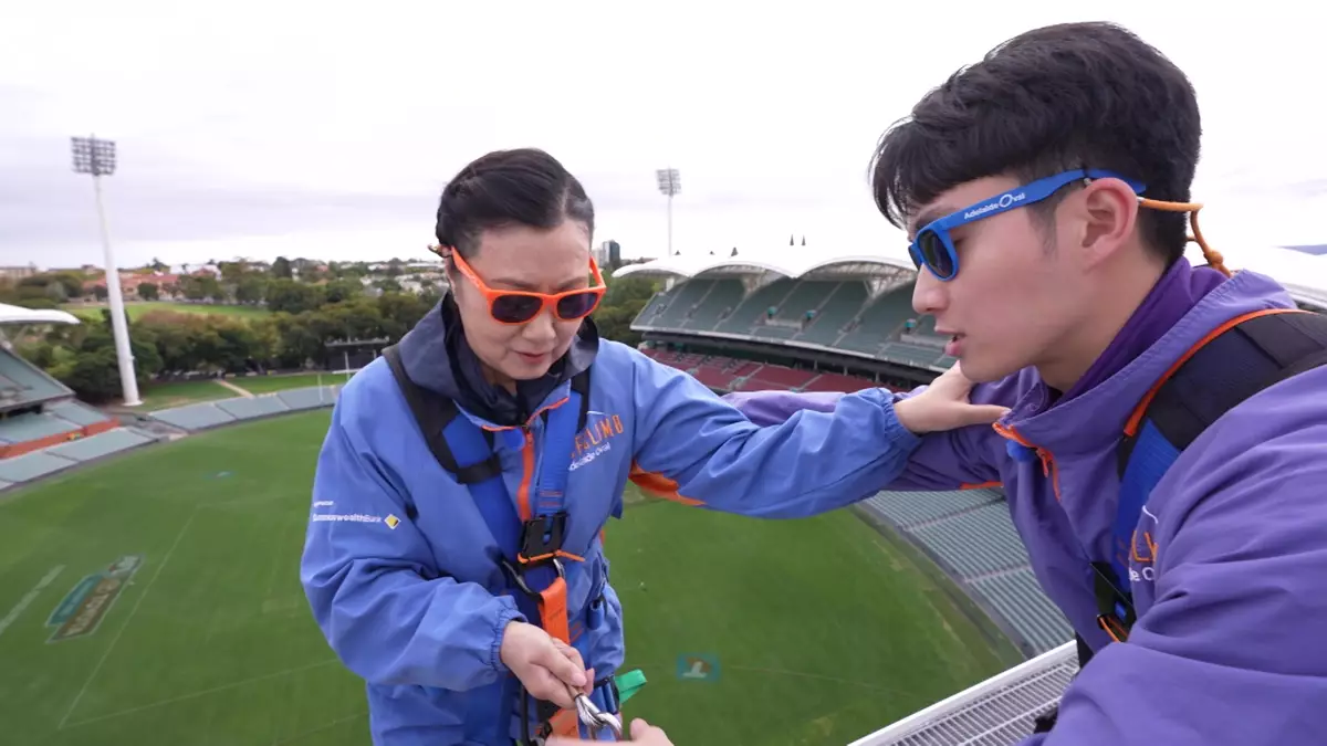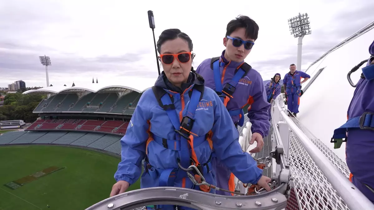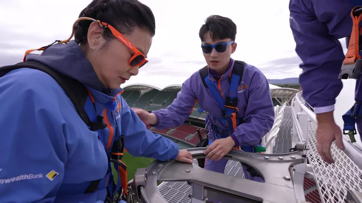 嘉洛帶阿姐登上Adelaide Oval 50米高空的橢圓球場,體驗Roof Climb。