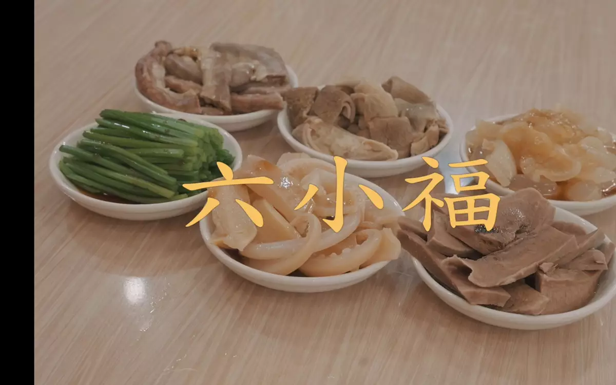 白灼海蜇、豬脷、魷魚、粉腸、豬肚、韭菜花為六小福。