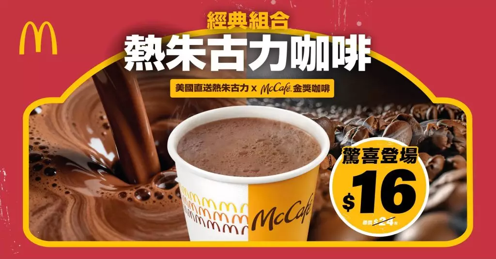 經典組合「$16熱朱古力咖啡 (參考價$24起)」集合麥當勞兩大招牌飲品,包括由美國直送的經典熱朱古力及採用McCafé金獎咖啡製成--McCafé咖啡採用的自家咖啡豆Cocoa Tazza兩年榮獲被譽為「咖啡界奧斯卡」的「IIAC 國際咖啡品鑑大獎」金獎,精選自埃塞俄比亞、秘魯和墨西哥的精品級別100% Arabica咖啡豆,揉合黃金比例調配而成,風味獨特。因此,熱朱古力咖啡入口充滿濃郁朱古力滋味和淡淡咖啡堅果香氣,是經典絕配,適合大家在任何時間於全線麥當勞品嚐。