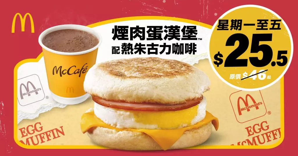 趁住50週年慶祝活動踏入尾聲,香港麥當勞特意由星期一(11月24日)起帶來經典組合熱朱古力咖啡,並同時驚喜推出港人最掛住的經典滋味之一「煙肉蛋漢堡」,期間限定的經典滋味「煙肉蛋漢堡配熱朱古力咖啡(細)」只售$25.5,與大家繼續麥麥慶祝 50 週年。同時,一系列McCafé 咖啡飲品將以限時優惠價登場,包括「$16 熱即磨黑咖啡或鮮奶咖啡 (細)」及「$19 凍即磨黑咖啡