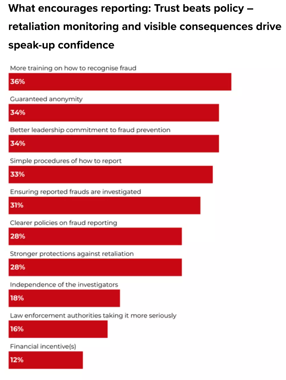 報告指出,文化因素仍然是防範詐騙的決定性因素。在許多亞太市場,公開討論詐騙行為被視為不忠,而階級制度文化也阻礙了舉報行為。因此,調查人員的獨立性和明確的防範報復措施至關重要,尤其是對於擔憂後果的初級員工而言。 區域調查結果顯示,舉報難易度平均得分為3.82/5,初級員工擔心遭到報復,顯示權力的不平等限制了向上舉報。受訪者強調,貼近文化的管治、透明的程序以及由領導層主導的問責制度能有效提升信任。