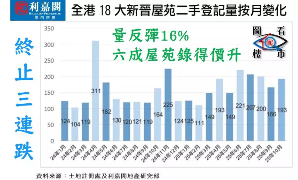 展望11月,在低息環境延續及財富效應推動下,筆者預料18個新晉屋苑二手登記量將再升約一成,挑戰210宗水平,香港樓市短線回暖趨勢已成。