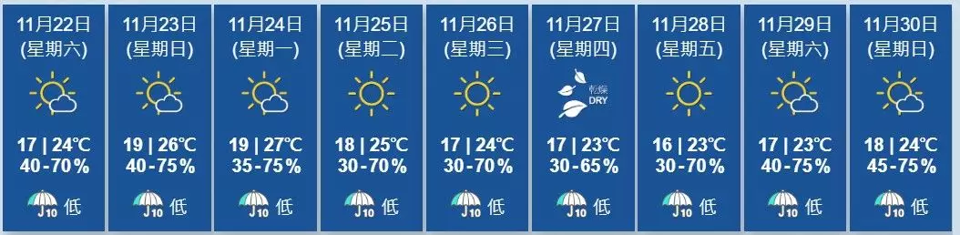 展望未來數日持續天晴乾燥,日夜溫差頗大。明日(11月23日)及星期一(11月24日)日間溫暖。預料季候風補充會在星期一晚上至星期二(11月25日)初時抵達華南沿岸,隨後兩三日該區早晚清涼,日間非常乾燥。