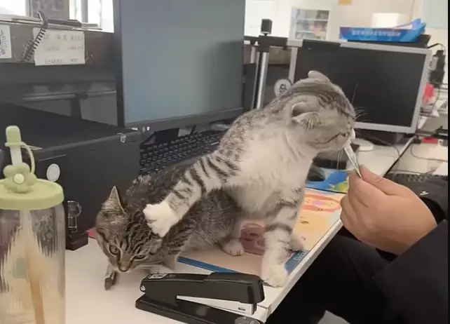 結果英短為了跟虎斑貓搶肉泥吃,竟然當場用爪推開同伴不准牠來分享。
