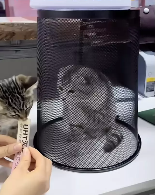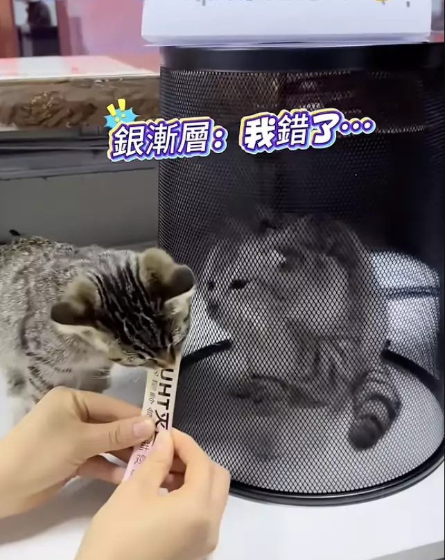 後來飼主直接祭出懲罰,用垃圾桶把英短關起來,虎斑貓才能放心吃肉泥,獨留欺負虎斑貓的英短「蹲監獄」。