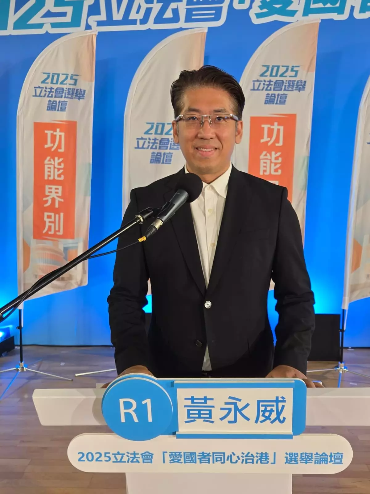 到抽籤回答問題環節。被問到若當選會如何實現香港工業發展未來幾年的願景,致力爭取具體成果,黃永威指應深化與內地互聯互通,並擴展至創科領域,整合兩地優勢,開發新中式產業;而北都重點應發展生物醫藥、金融科技、AI及機械人應用等領域。對外方面,他認為,香港作為企業出海的理想平台,配合特區政府的專班,為內地企業提供一站式高端專業服務,爭取加入「區域全面經濟夥伴關係協定」(RCEP),助力國家開拓新興市場。