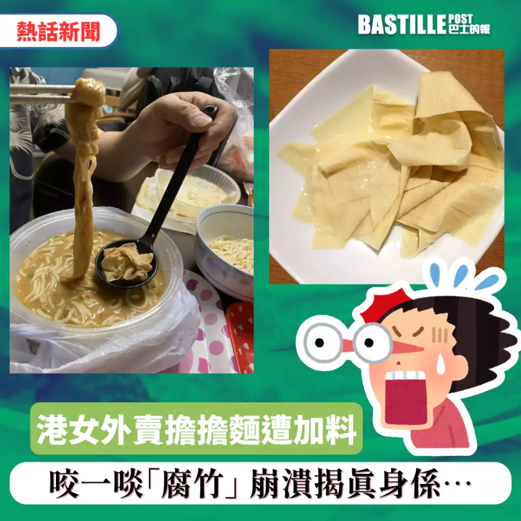 有港女在大埔一間食店叫了擔擔麵外賣,開始吃時夾起一大條物體,她以為是「腐竹」,但又覺得擔擔麵不應有腐竹,於是她咬一啖想確認一下是不是腐竹,才發現竟是一大條廁紙,令人嘔心至極。