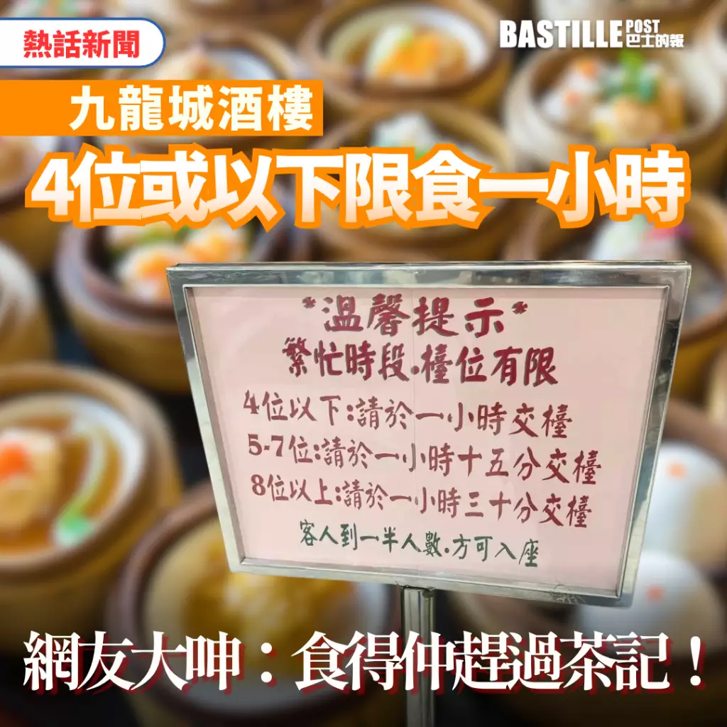 近年香港人都喜歡北上消費,除了貪其價廉物美,用餐時還不會限時限刻催三催四,可以慢慢享用。但反觀香港,很多餐廳老闆為了做多幾枱客生意,在繁忙時段都會限時用餐,近日就有網民指九龍城一間酒樓於繁忙時間指明4位或以下要限1小時交枱,入座時她並沒有為意,及後被「態度好差」催交枱,十分激氣,大呻「就算食物正常都無下次了,好趕客」。