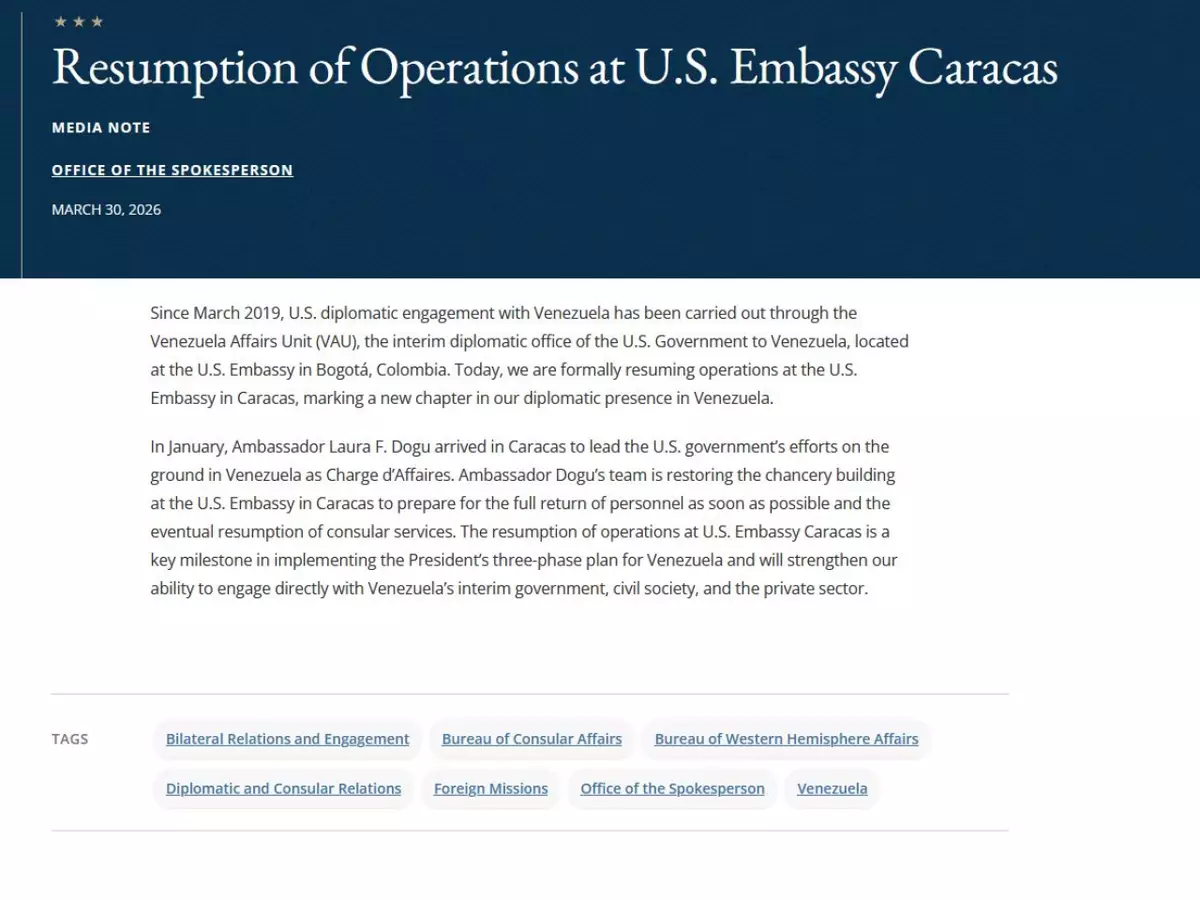 美國國務院的聲明說,設在委內瑞拉首都加拉加斯的美國大使館恢復運作,標誌著美國在委內瑞拉的外交存在進入新階段,美國在當地的外交團隊正在修繕使館館舍,以便盡快安排所有人員返回並恢復領事服務。