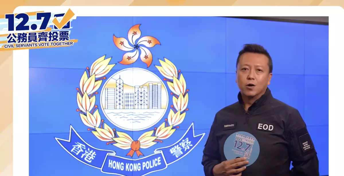 警方爆炸品處理課高級炸彈處理主任李展超,以印尼語向選民作出投票呼籲。楊何蓓茵FB圖片
