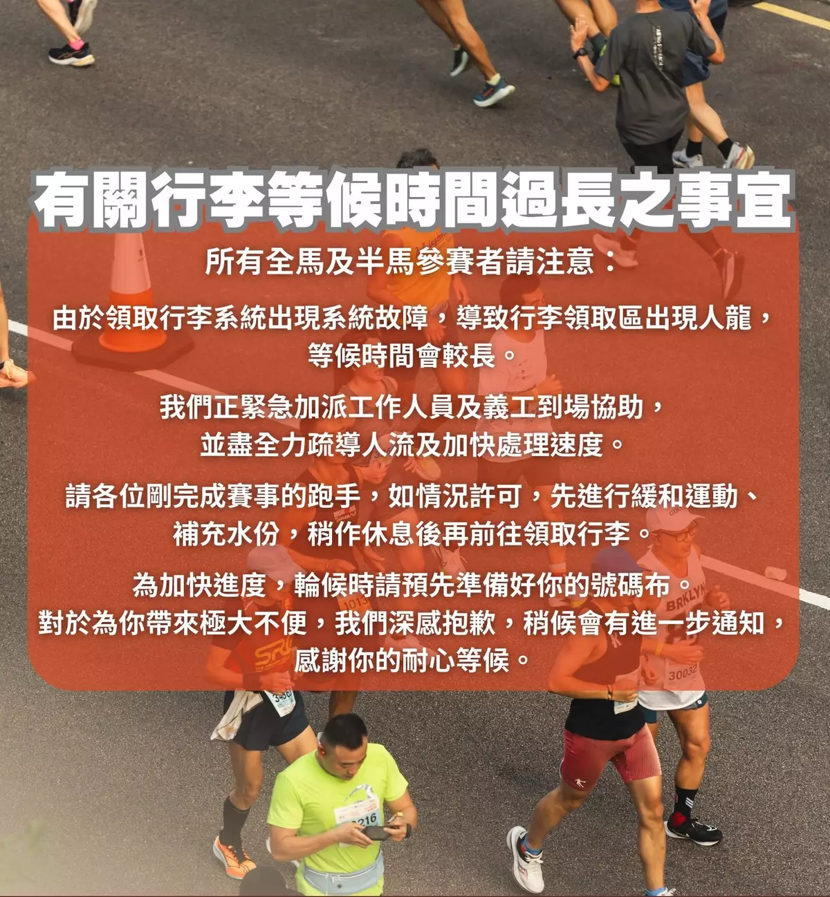 大會在社交網站說,領取行李系統出現故障,導致領取區出現人龍,等候時間較長,對此深感抱歉,現正緊急加派工作人員和義工到場協助,並盡全力疏導人流和加快處理速度,呼籲完成賽事的跑手如情況許可,可先進行紓緩運動、補充水份,稍作休息後再前往領取行李。