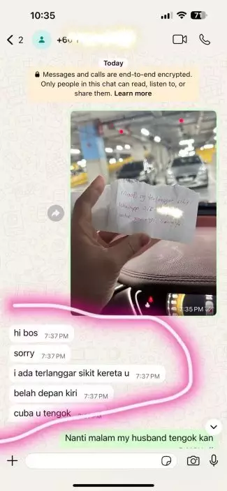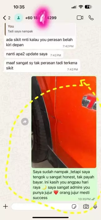 鄭小姐經檢查後發現車身損傷不大,預估維修費約500至600令吉(約973港元至1167港元)。鄭小姐隨後依照紙條聯絡對方,對方立即致歉並表示願意負擔維修費。據瞭解,肇事者為27歲馬來裔男子法希(Faheem),任文書工作。事發當時,他倒車時因孩子突然要抱,一時分心才不慎撞上車輛。雖經濟狀況並不寬裕,但他仍堅持要承擔責任。他憶述,「當下真的很慌也很自責,但不想直接離開,所以到商場買紙筆,寫下道歉信並留下電話」。