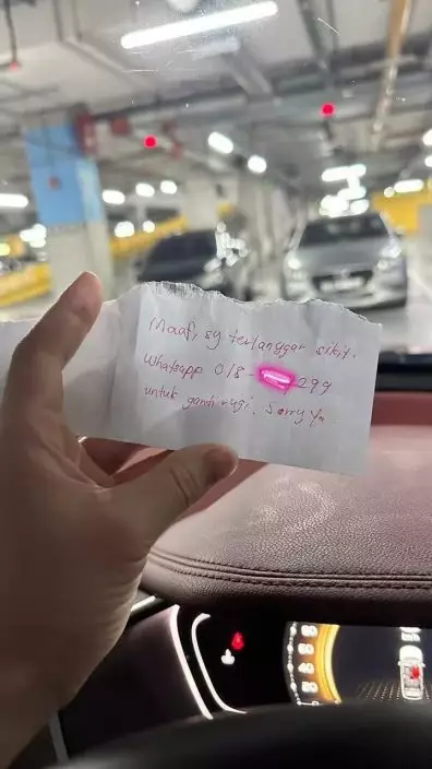 3月20日傍晚,馬來西亞一名32歲華裔女子鄭小姐在Toppen購物中心逛街後取車時,發現前擋風玻璃雨刷夾著一張紙條,起初還以為是罰單,仔細一看發現竟是一張手寫紙條,這才得知車輛曾遭擦撞,而肇事司機則在紙條中表達歉意並留下聯絡方式。