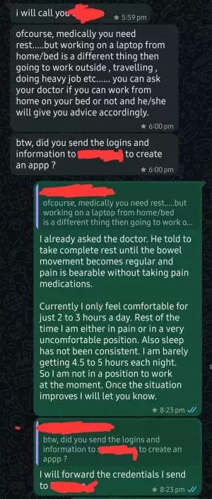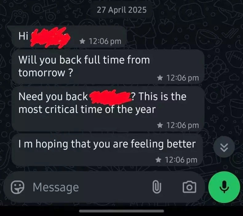 術後第3日,主管開始關注她的康復情況,之後直接要求她「臥床工作」。至第7日,主管再度逼問,「你甚麼時候能回來上班?」全然無視她已提交的醫生證明及經批准的病假申請。女子也在帖文中附上與主管的WhatsApp對話截圖,可見主管屢次催促她復工。
