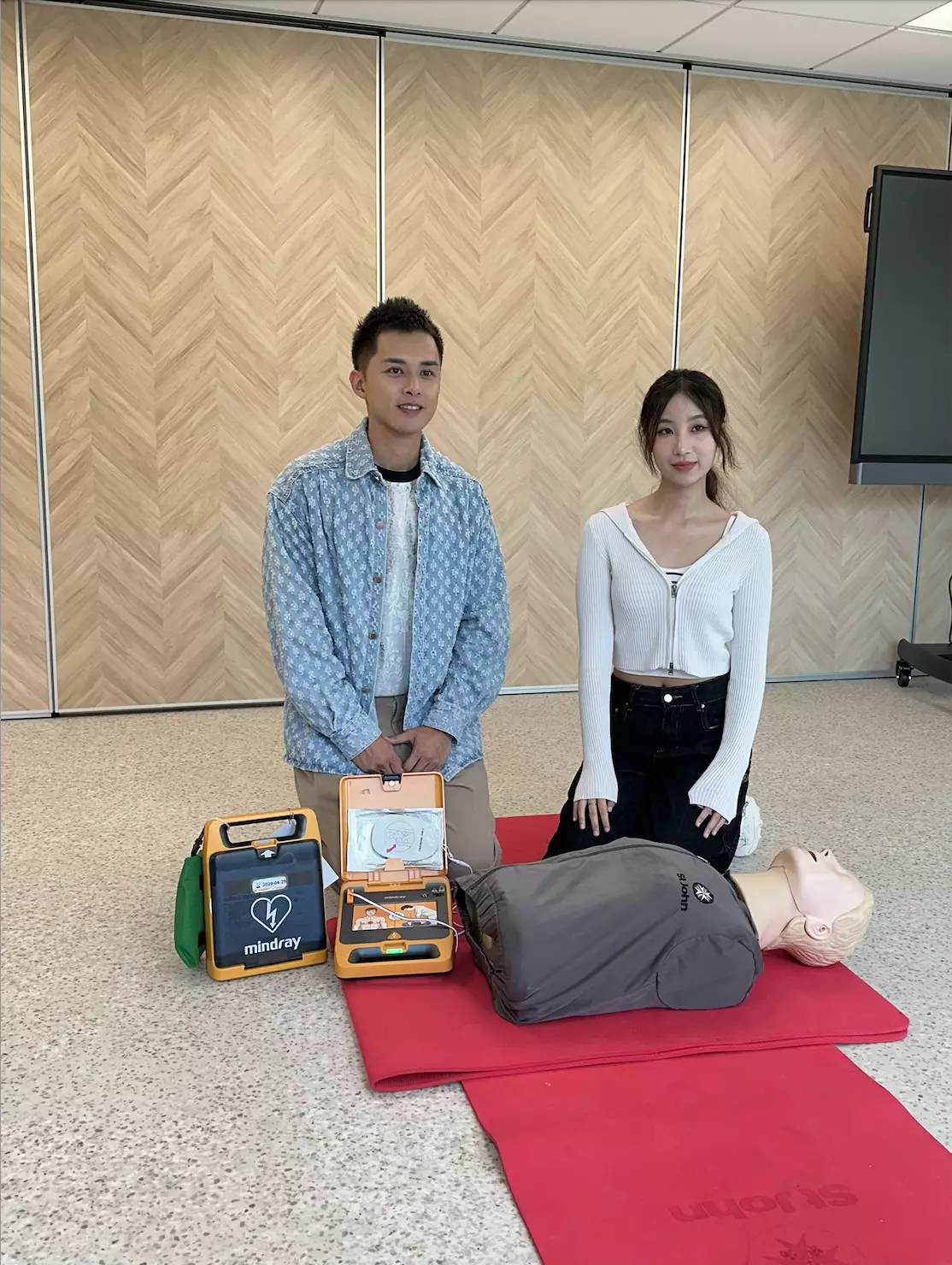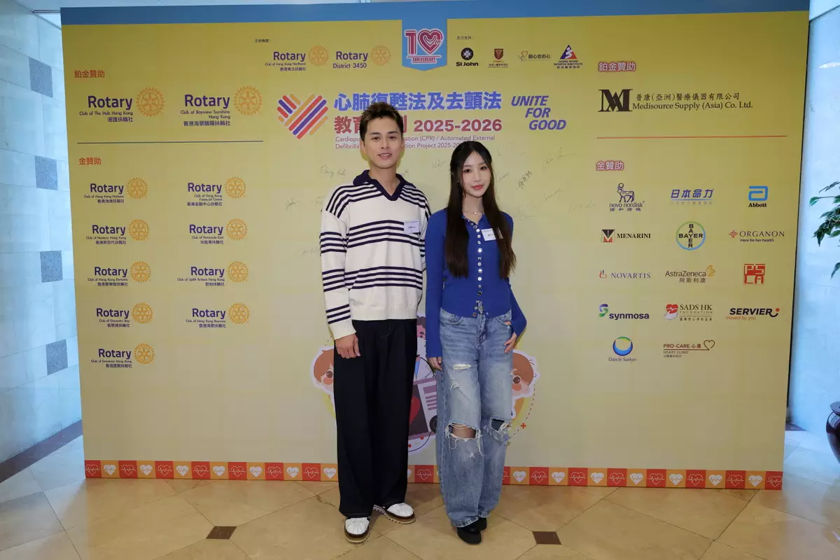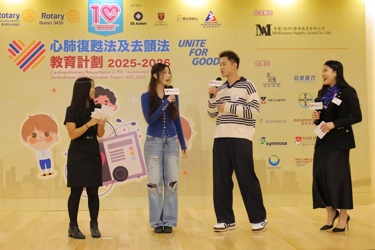11月22日出席,由國際扶輪3450地區、香港東北扶輪社及香港聖約翰救護機構合辦的「心肺復甦法及去顫法教育計劃2025-2026啟動典禮」在香港聖約翰救護機構總部舉行,宣傳大使何廣沛(Matthew)及詹天文(Windy)出席,二人早前抽空完成6小時「心肺復甦法及去顫法證書課程」,並成功通過考核獲頒急救證書。
