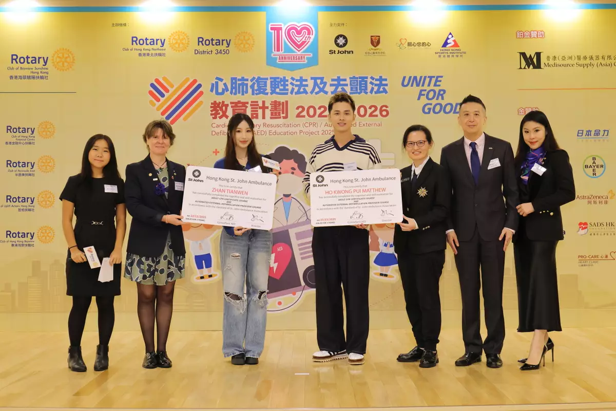 由國際扶輪3450地區、香港東北扶輪社聯同香港聖約翰救護機構舉辧的「心肺復甦法及去顫法教育計劃2025-2026啟動典禮」,於11月22 日在香港聖約翰救護機構總部舉行。
