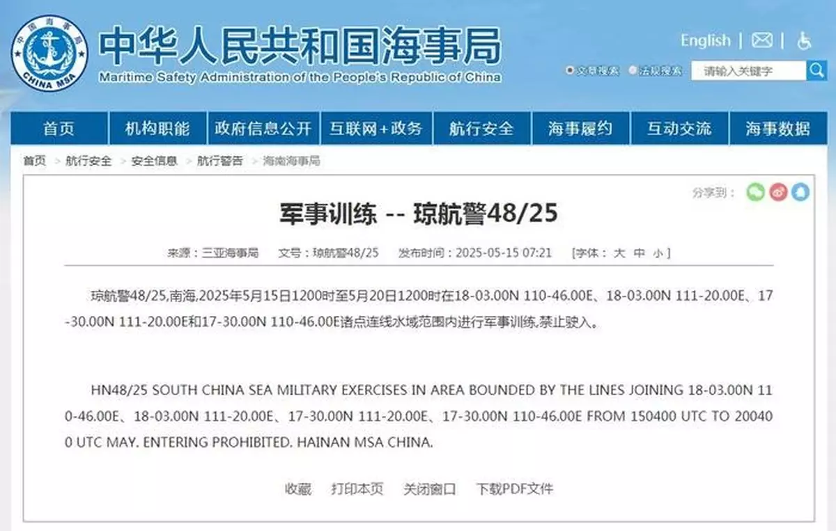 中國海事局發出三沙海事局的航行警告,表示南海部分海域,今天和明天會舉行軍事訓練,禁止船隻駛入。