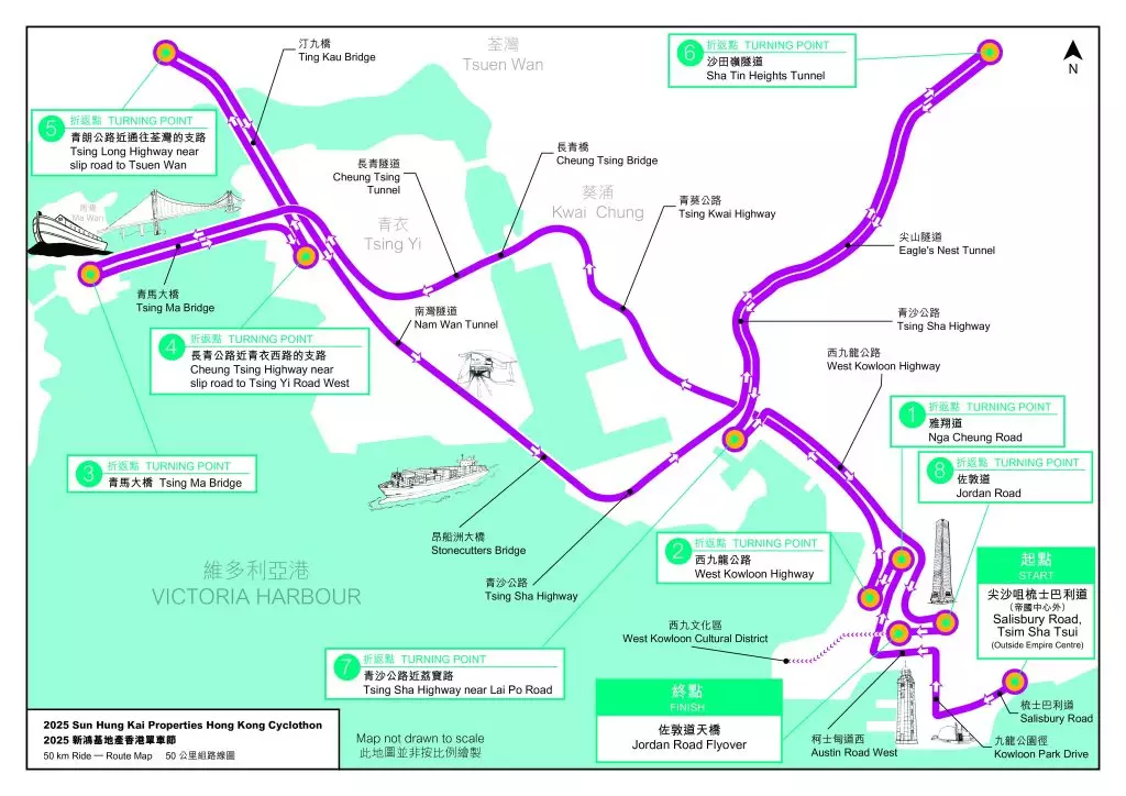「50 公里組」路線涵蓋「四隧三橋」,包括:長青隧道、南灣隧道、尖山隧道、沙田嶺隧道、青馬大橋、汀九橋及昂船洲大橋。