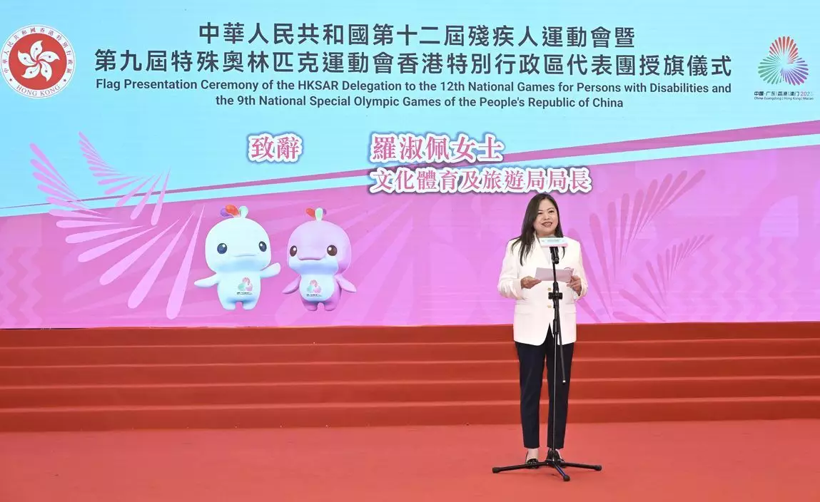 香港特區代表團團長、文化體育及旅遊局局長羅淑佩在授旗儀式致辭時說,粵港澳三地承辦今屆賽事,不僅體現了大灣區進一步融合發展,更充分展現三地攜手合作,共同打造高水平體現盛事的決心和能力。她指出,殘特奧會是一個運動員展現毅力和堅毅精神的舞台,是一個每個人都可以親身支持的國家盛事,更是深化家國情懷、鞏固國民身份認同的重要機會。