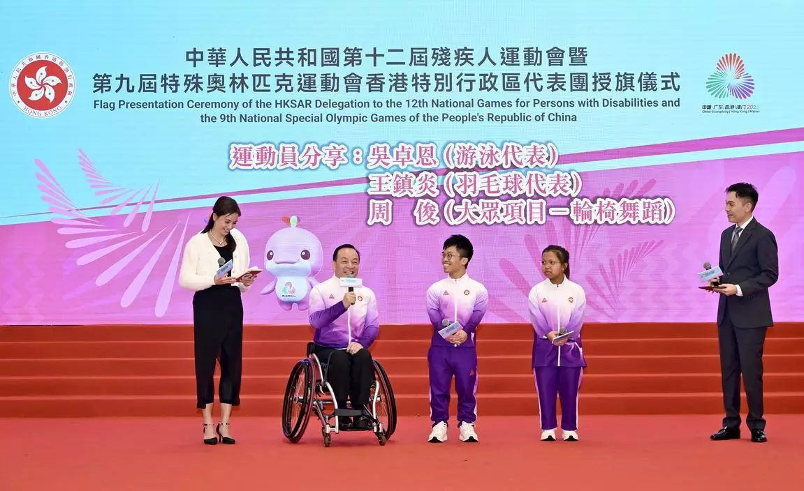 李家超祝願代表團成員延續十五運會香港特區代表團取得歷史佳績的聲勢,在殘特奧會全力以赴,在各項賽事發光發亮。他又說,今次是香港自回歸以來第八次參加殘運會及第六次參加特奧會,將派出歷來規模最大的代表團,包括超過280位運動員及約140位隨隊工作人員和醫護人員參與。香港將承辦殘特奧會4個競賽項目和1個大眾項目,定必繼續致力與廣東省和澳門攜手,辦好這場簡約、安全、精彩的體育盛會。