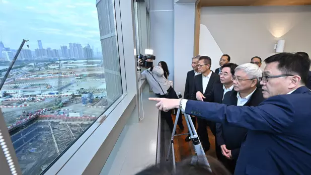 侯建國(右二)、祝衛東(右三)與陳茂波(右四)視察河套深港科技創新合作區香港園區。(政府新聞處)
