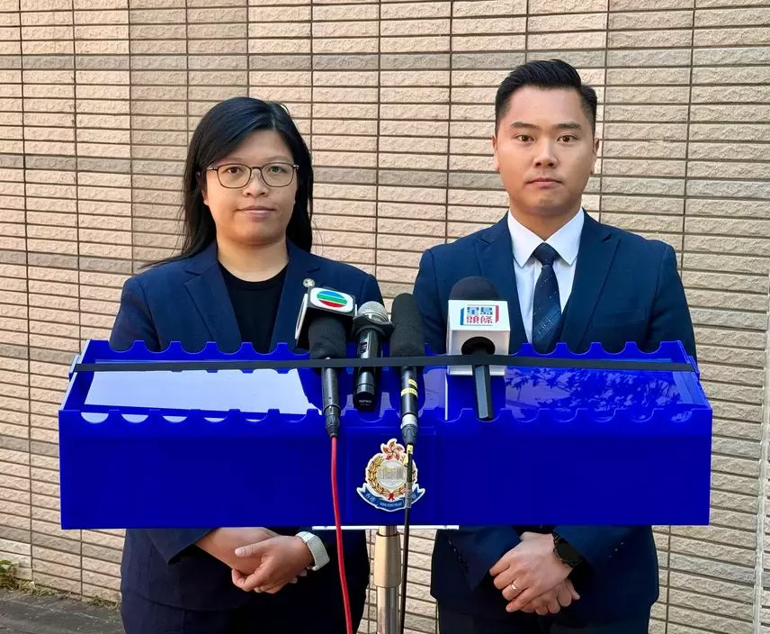 警方財富情報及調查科高級督察申文燕(左)及東九龍總區科技及財富罪案組高級督察李泳鋒現向傳媒簡介法庭判刑。