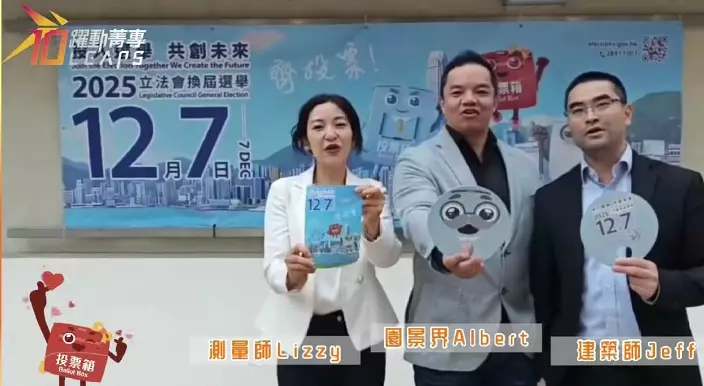 宣傳片中個個充滿幹勁呼籲大家「投入選舉,共創未來」,12月7日齊投票。