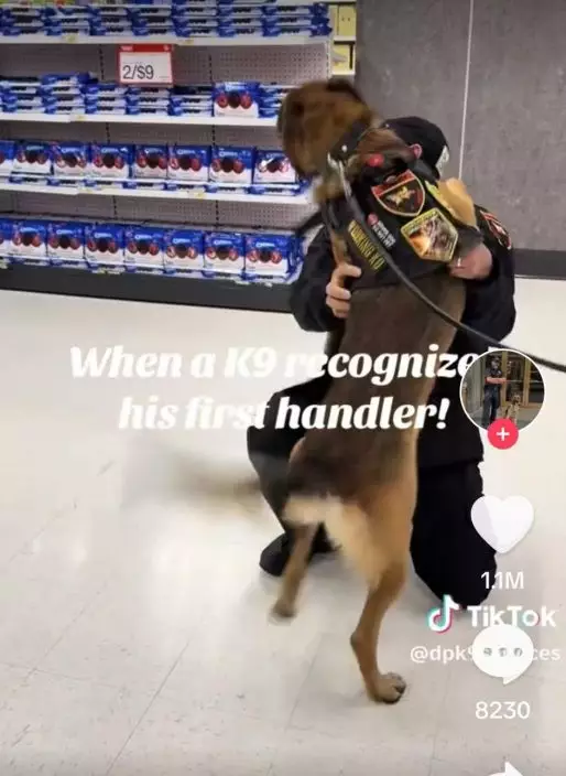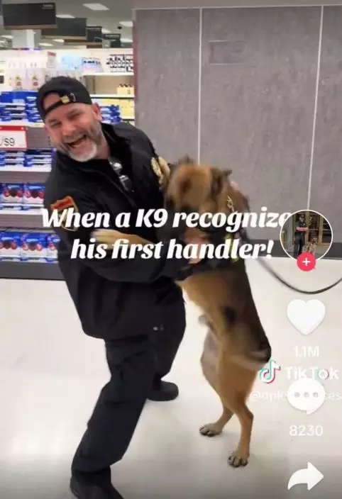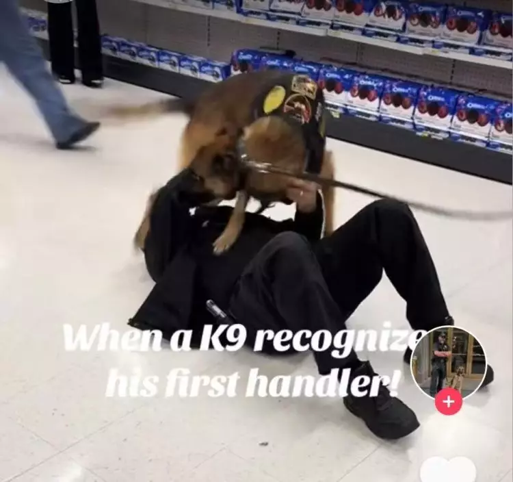 日前,國外一隻德國牧羊犬在現任領犬員的陪伴下前往商店進行例行巡視,執勤期間,牠表現冷靜專業。直至靠近一名男子時,牠突然停下腳步,表情瞬間由嚴肅轉為興奮,緊接著撲向對方。