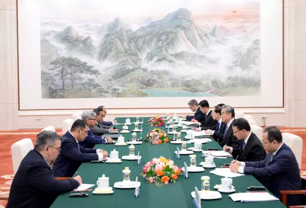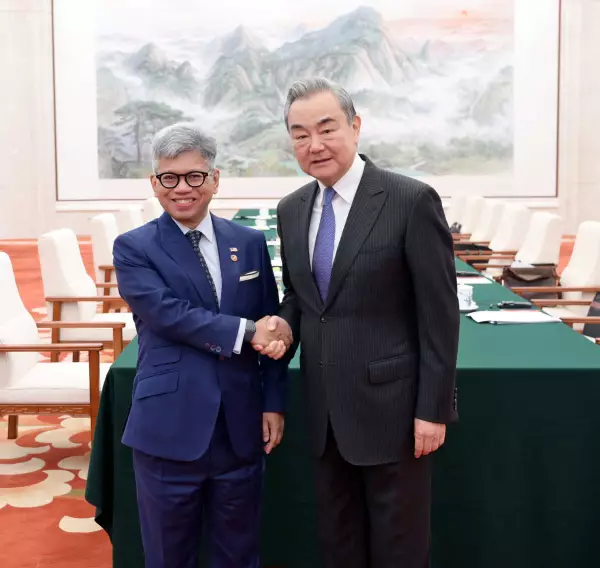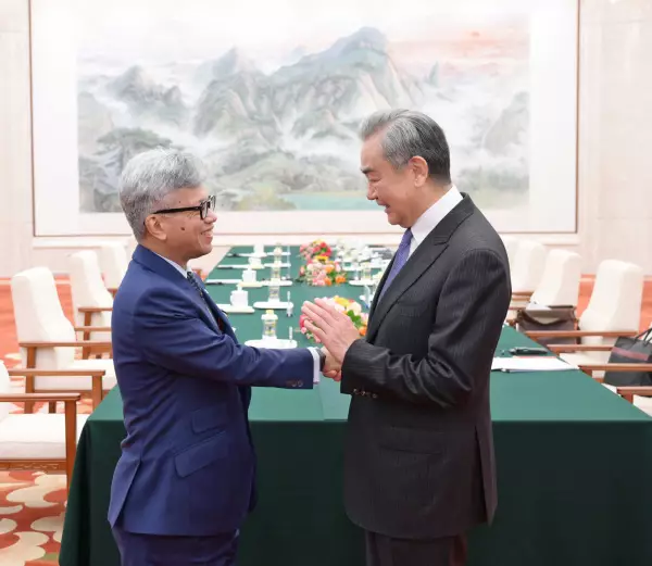 中共中央政治局委員、中央外辦主任王毅在北京會見來華出席中馬海上問題雙邊對話第二次會議的馬來西亞國家安全委員會主任努西爾萬。