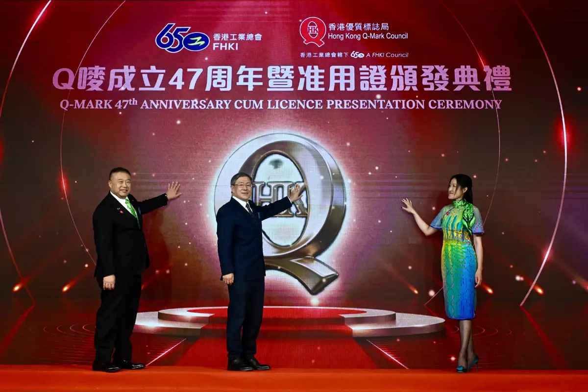 政務司副司長卓永興(中)出席Q嘜成立47周年暨准用證頒發典禮,與香港工業總會主席林世豪(左)和香港工業總會副主席、香港優質標誌局主席陳嘉賢(右)主持開幕典禮。 政府新聞處圖片