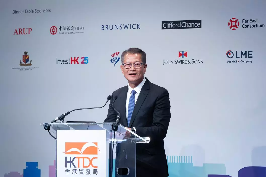 陳茂波在由香港貿易發展局舉辦的「香港晚宴」上發表主題演講。政府新聞網圖片