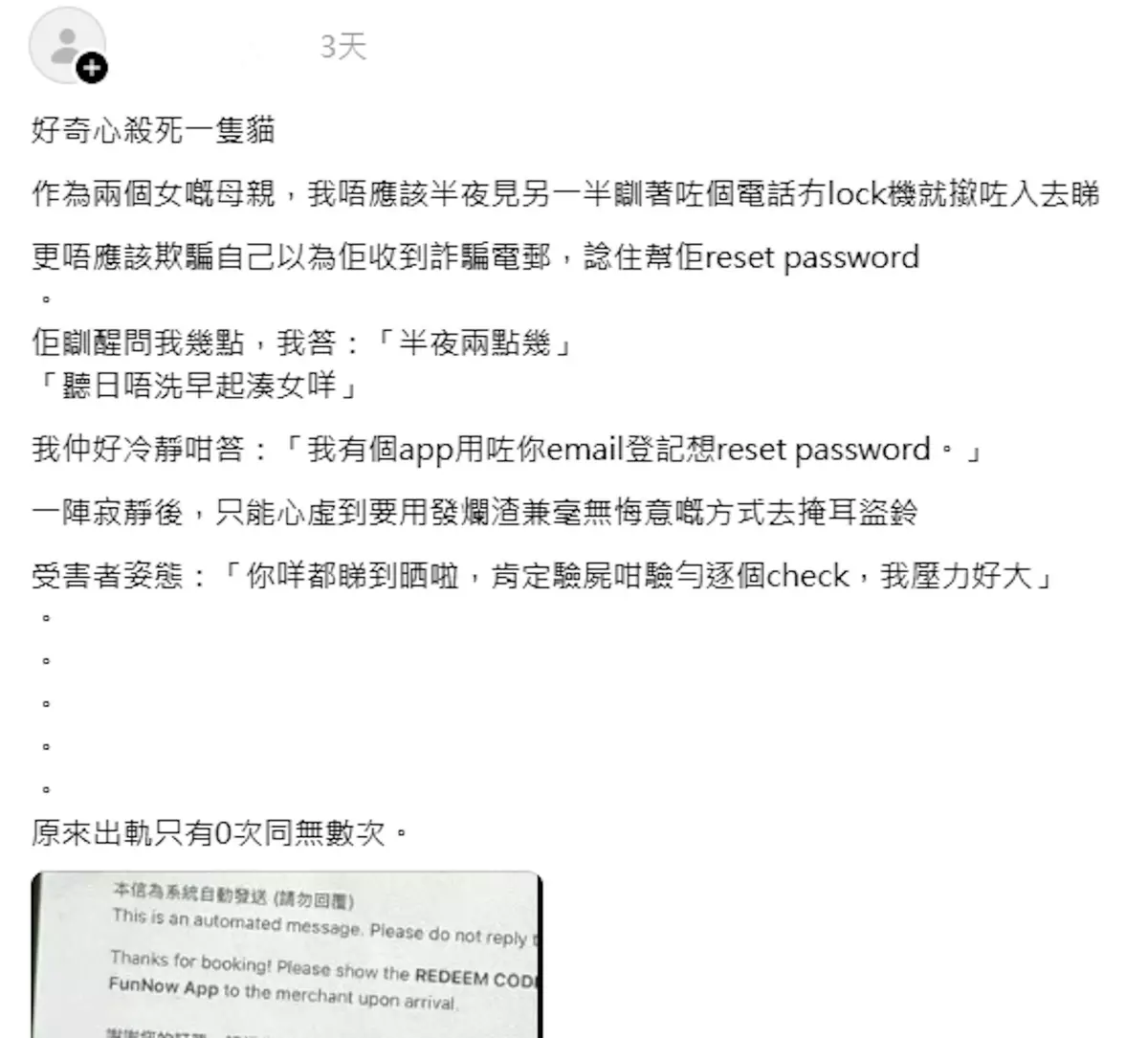 事主在首篇帖文中坦言, 自己犯下「唔應該」的錯——趁丈夫深夜熟睡時 查看其未上鎖的手機。她發現一封時鐘酒店預約確認電郵,內容明確顯示「2人入住」、「2小時」及港幣268元交易金額。當丈夫凌晨醒覺手機被查看後,竟以「受害者姿態 」反駁:「你咩都睇到晒啦,肯定驗屍咁驗勻逐個check,我壓力好大」。