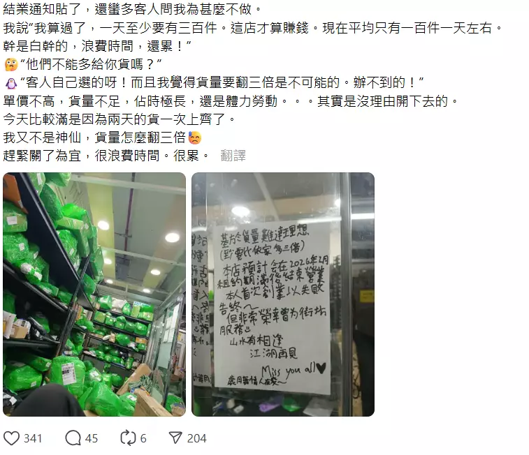 該名老闆在threads 發文嘆到「結業通知貼了,還蠻多客人問我為甚麼不做。」他解釋計過數,一天最少要有三百件貨,店才會賺錢。但現在平均每日只有約一百件,大呻「幹是白幹的,浪費時間,還累!」他更表示即使貨量增加三倍,都無可能賺錢,因為自己已經「辦不到」他細數經營這門生意主要遇4大問題:「單價不高,貨量不足,佔時極長,還是體力勞動」,他坦言繼續經營只是「很浪費時間。很累」,所以「趕緊關了為宜」。