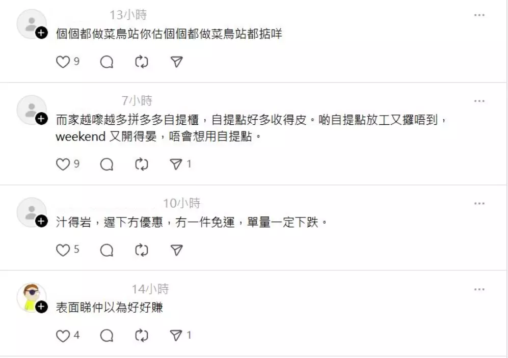 網民看帖文後都議論紛紛,留言「表面睇仲以為好好賺」、「好似得$2.5-$3一件」。有網民認為自取點的優勢已大不如前,因為多了網購平台提供送貨上門服務,還有24小時運作的自提櫃,所以此行業競爭愈來愈激烈,但利潤卻少得很。「做唔掂係正常,我加多少少就送上門,洗乜去舖頭排隊/自己慢慢搵」、「最近好似多咗自提點唔做,我平時拎開果間都結業」。更有留言道出原因,「返工前佢又未開門,放工返嚟又閂門」,營業時間不能配合打工一族。