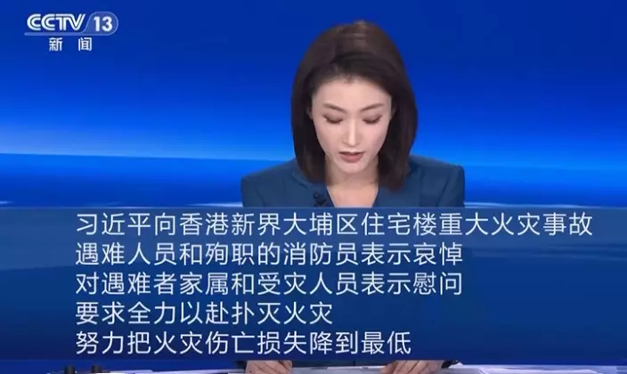 央視報道,香港大埔宏福苑多棟住宅發生火災,造成重大人員傷亡。在事故發生後,國家主席習近平高度重視,第一時間了解火災救援和人員傷亡等情況,指示中央政府駐香港聯絡辦負責人向行政長官李家超轉達他對遇難人員和殉職的消防員的哀悼、對遇難者家屬和受災人員的慰問。
