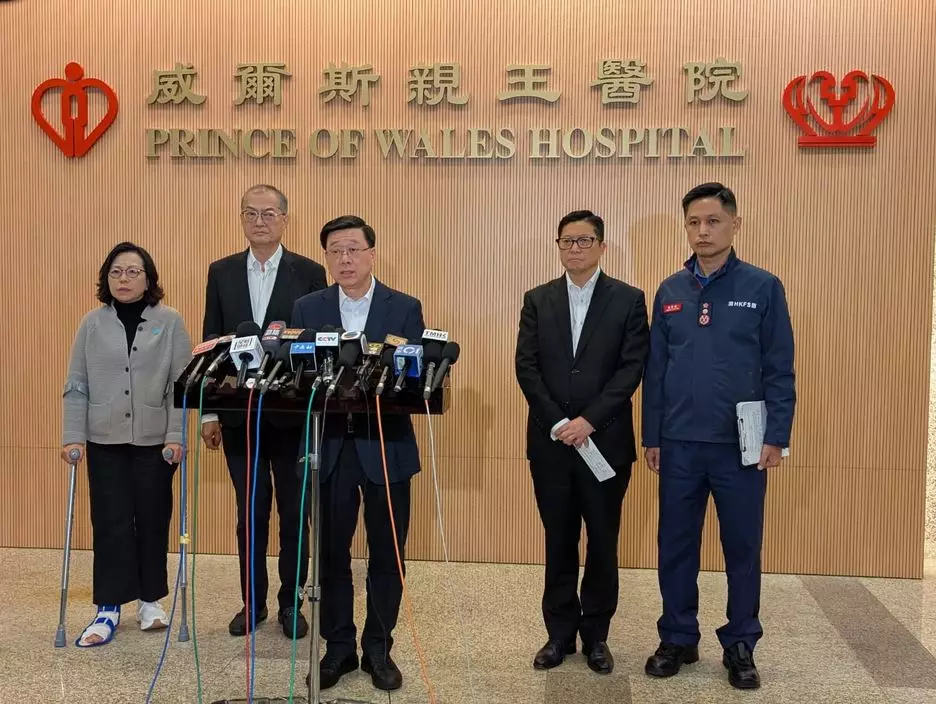 行政長官李家超27日凌晨偕多名局長到沙田威爾斯親王醫院探望傷者,之後會見記者,講述火災最新情況。