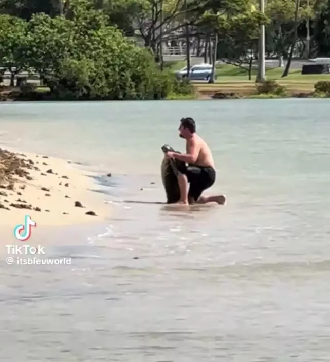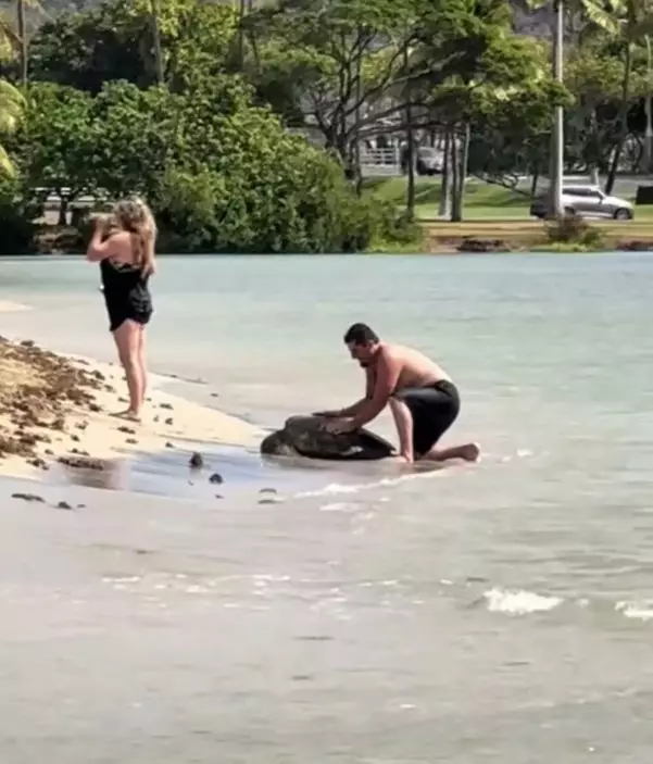夏威夷海灘一名男遊客強抱海龜擺拍惹眾怒,或觸當地法例面臨重罰。