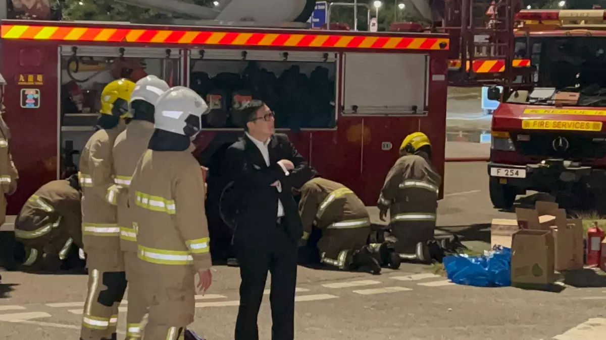 鄧炳強27日凌晨到火警現場了解。巴士的報記者攝
